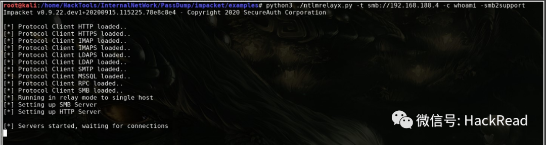 我们可以借助impacket的ntlmrelayx.py模块来实现NTLM中继攻击,具体步骤如下:
