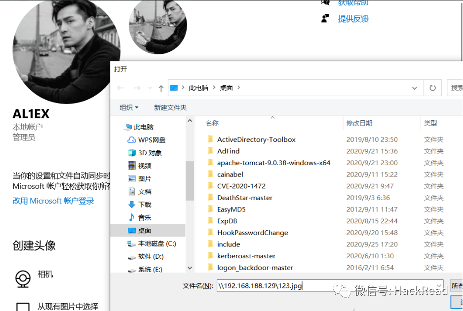 此方法适用于Windows 10/2016/2019,在更改账户图片处用普通用户的权限指定一个webadv地址的图片,如果普通用户验证图片通过,那么SYSTEM用户(域内是机器用户)也去访问192.168.188.129,并且携带凭据,我们就可以拿到机器用户的net-ntlm hash,这个也可以用来提权随后可以获得NTLM-Hash值: