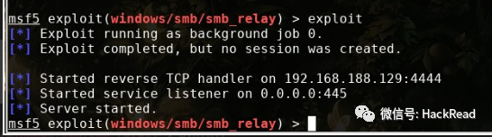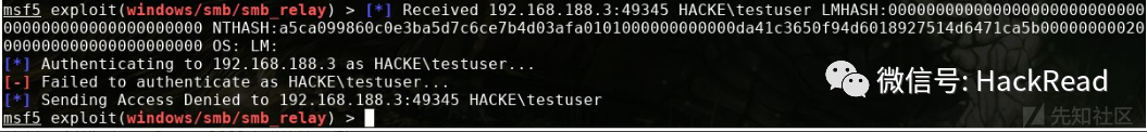 Step 4:由于Metasploit的SMBRelay只支持NTLM v1,所以在攻击一些机器时会出现"Failed to authenticate"的情况,但是这种思路是正确的,所以综合来看这种攻击方法在实战中也不是那么被看好