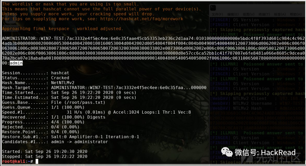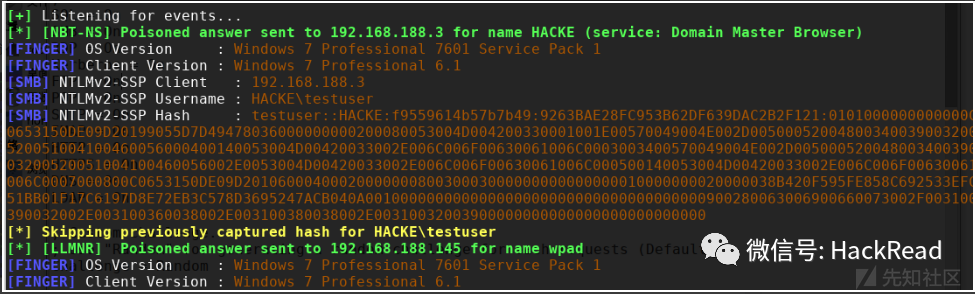 之后在我们的攻击主机中可以看到被记录的Net-NTLM Hash值: