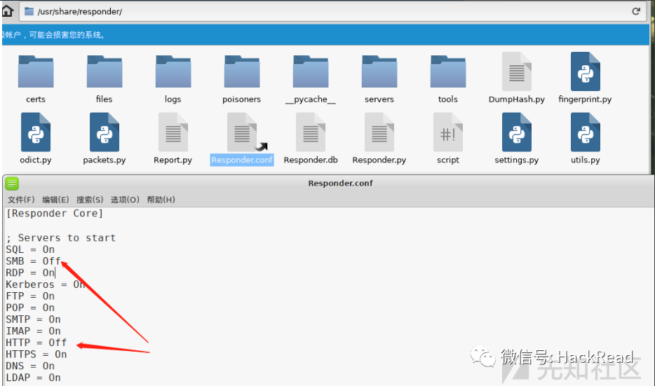 Step 1:进入到/usr/share/responder目录下,编辑Responder.conf文件,设置smb和http为Off,在攻击时直接利用该hash攻击其他机器即可不需要抓取