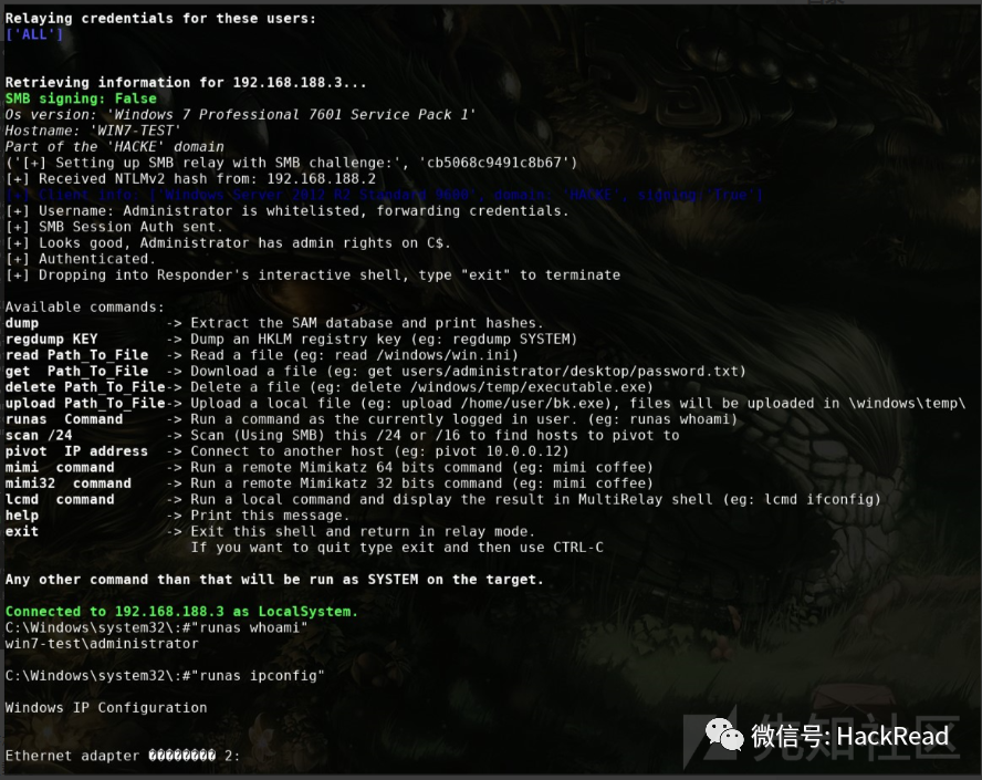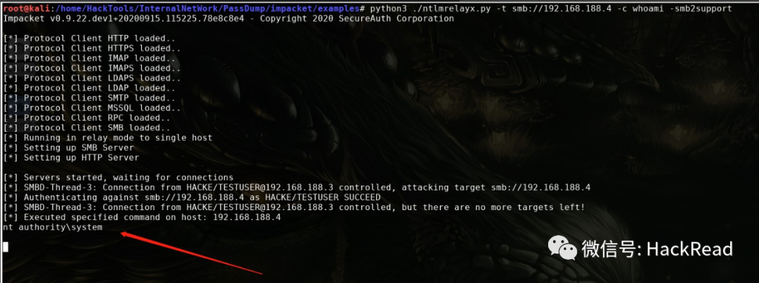 Step 3:在攻击主机上可以Relay域用户的Net-NTLM Hash,从而在域内其他主机上执行指定的命令
