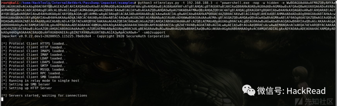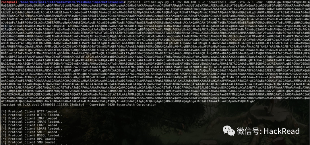 Step 5:之后使用impacket中的ntlmrelayx执行以下命令,条命令是对中继成功的机器自动执行powershell并获取agent,powershell脚本放在引号中