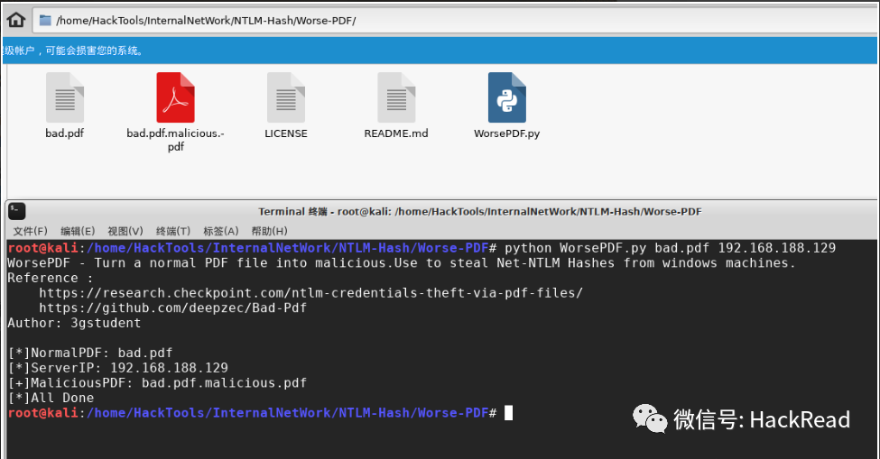 PDF规范允许为GoTobe和GoToR条目加载远程内容,PDF文件可以添加一项功能,请求远程SMB服务器的文件,我们直接使用三好学生的脚本https://github.com/3gstudent/Worse-PDF