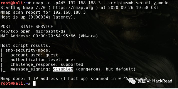目标SMB签名需要关闭,在SMB连接中需要使用安全机制来保护服务器和客户端之间传输数据的完整性,而这种安全机制就是SMB签名和加密,如果关闭SMB签名,会允许攻击者拦截认证过程并且将获得hash在其他机器上进行重放,从而获得域管权限,目前SMB常用来做为SMB文件共享、打印机,如果签名关闭可能导致文件共享、打印机被入侵,我们可以使用nmap来确定是否关闭: