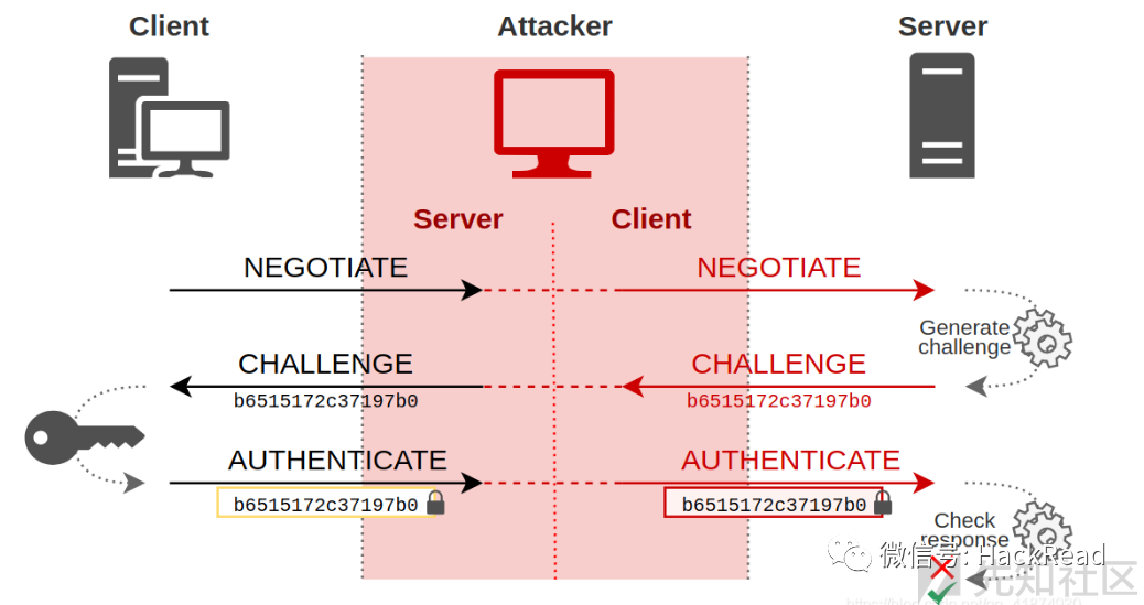 在上图中的客户端视角里,攻击者就是他要访问的服务端,它在与攻击者这台主机进行NTLM认证,而整个流程也只有攻击者这台主机与其进行交互,而在服务端的视角里攻击者是客户端,攻击者在向服务端证明自己的身份,通过中间人攻击的方法,攻击者可以伪造成客户端来完成身份验证,其实攻击者所做的事情只是把所有客户端的请求Relay到服务端并把所有服务端的请求Relay到客户端,而在服务端看来一直以来只有攻击者在跟他交互,所以自然而然就认为攻击者就是客户端,这样子攻击者就达到了伪造成真正客户端的目的