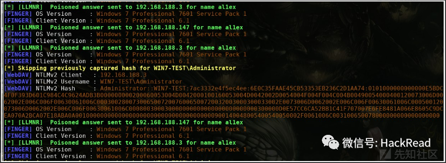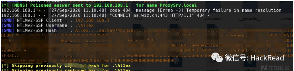 攻击者告诉客户端它是Al1ex,并接受被害者发送用于认证的NTLM v2哈希值,保存于本地