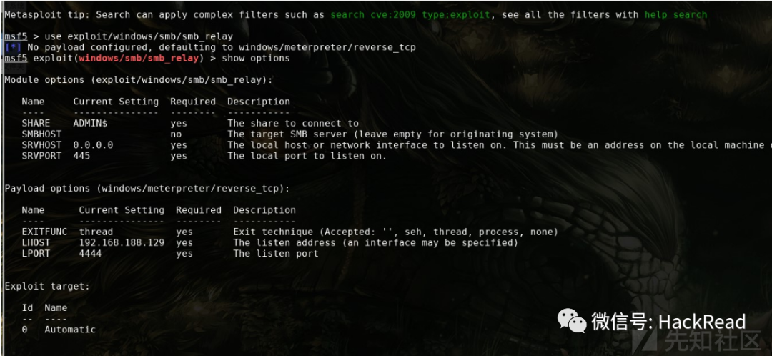 这里使用MSF框架中的smb_relay模块来实施SMB中继攻击