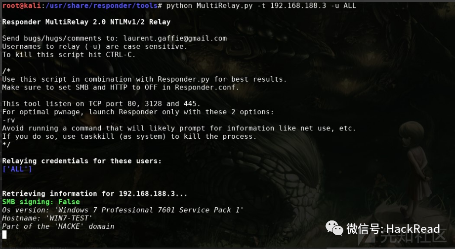 在实战中我们可以使用Responder + impacket + MSF来实现获取Net-NTLM hash,并通过ntlm中继获得域内普通用户的msf shell,具体步骤如下: