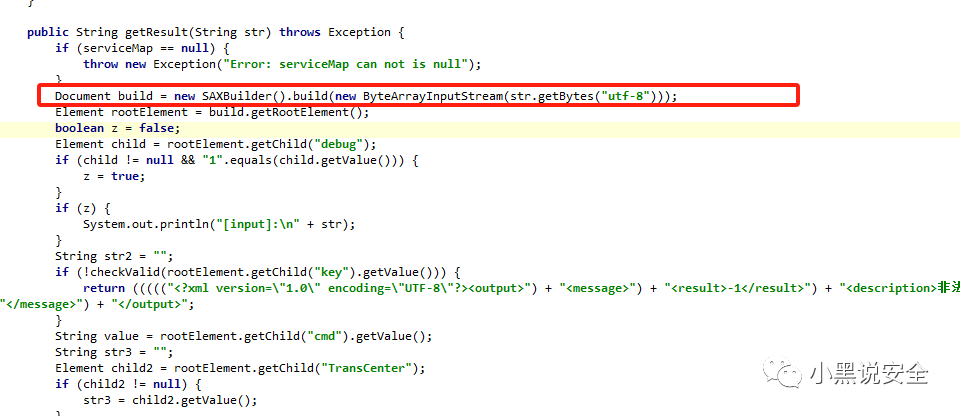 可以看到使用JDOM解析器,但没有禁止外部实体,所以产生了xxe漏洞。
