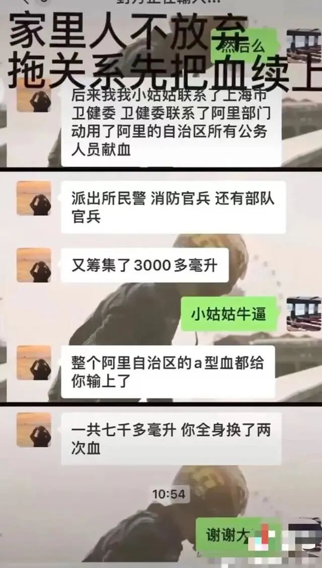 “整个阿里自治区的a型血都给你输上了”......“派出所民警 消防官兵 还有部队官兵”......