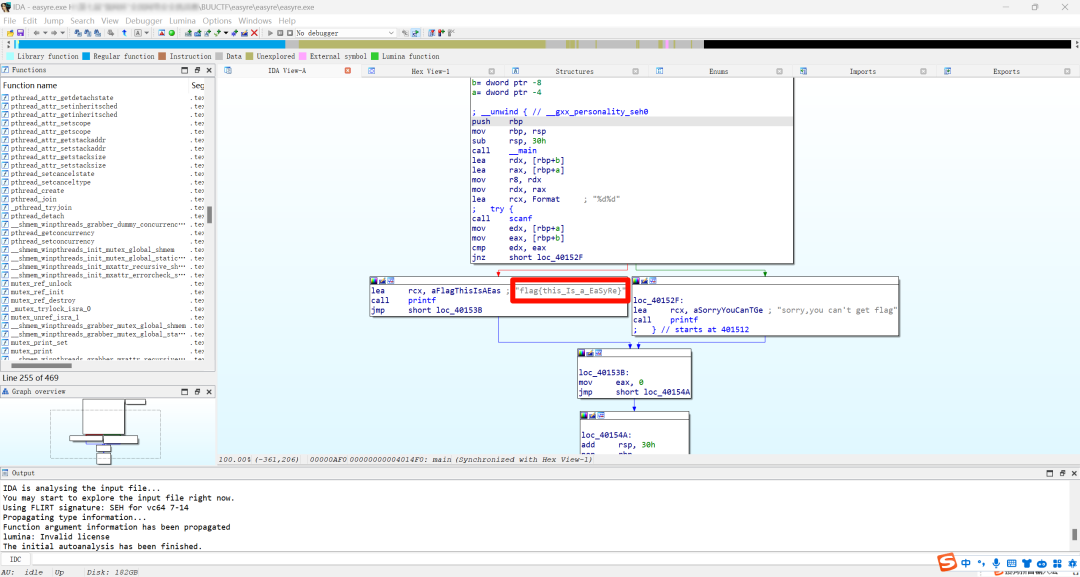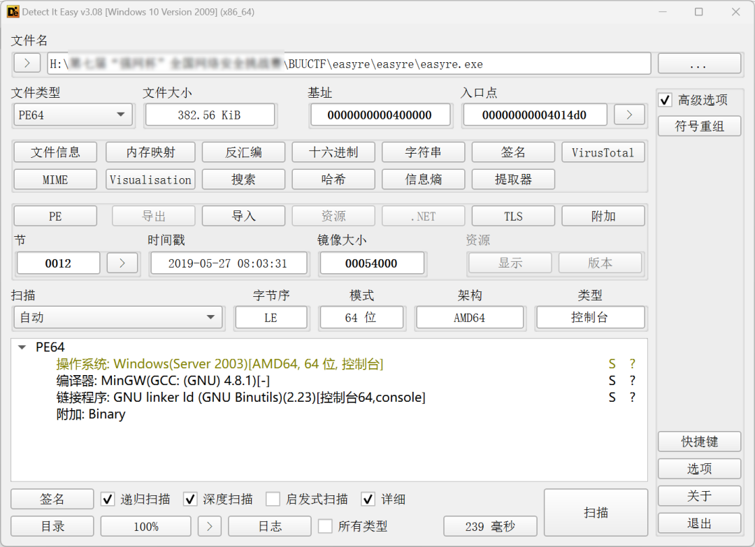 https://github.com/horsicq/DIE-engine/releases信息:文件名: H://BUUCTF/easyre/easyre/easyre.exe大小: 391745(382.56 KiB)操作系统: Windows(Server 2003)架构: AMD64模式: 64 位类型: 控制台字节序: LE