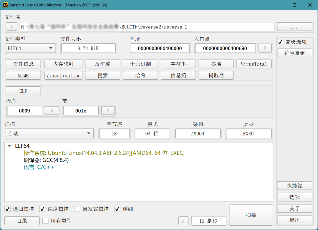 信息:文件名: H://BUUCTF/reverse2/reverse_2大小: 8953(8.74 KiB)操作系统: Ubuntu Linux(14.04.3,ABI: 2.6.24)架构: AMD64模式: 64 位类型: EXEC字节序: LE