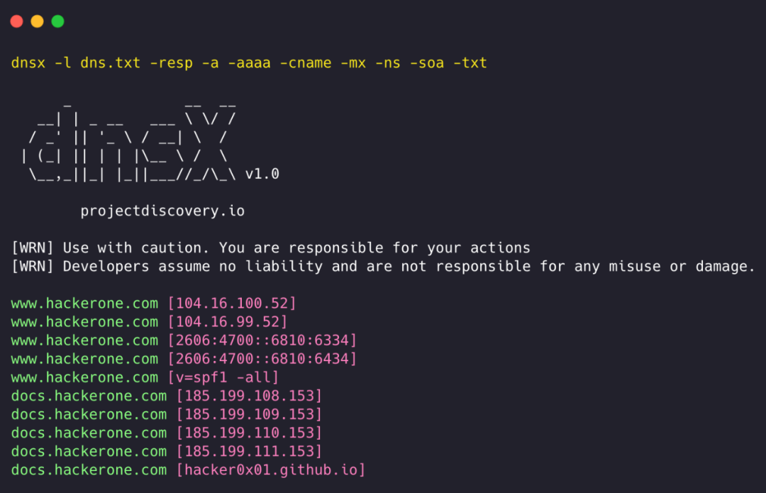 dnsx需要go1.19才能安装成功。运行以下命令安装最新版本:go install -v github.com/projectdiscovery/dnsx/cmd/dnsx@latestdnsx -hINPUT:-l, -list string list of sub(domains)/hosts to resolve (file or stdin)-d, -domain string list of domain to bruteforce (file or comma separated or stdin)-w, -wordlist string list of words to bruteforce (file or comma separated or stdin)QUERY:-a query A record (default)-aaaa query AAAA record-cname query CNAME record-ns query NS record-txt query TXT record-srv query SRV record-ptr query PTR record-mx query MX record-soa query SOA record-axfr query AXFR-caa query CAA record-any query ANY recordFILTER:-re, -resp display dns response-ro, -resp-only display dns response only-rc, -rcode string filter result by dns status code (eg. -rcode noerror,servfail,refused)PROBE:-cdn display cdn name-asn display host asn informationRATE-LIMIT:-t, -threads int number of concurrent threads to use (default 100)-rl, -rate-limit int number of dns request/second to make (disabled as default) (default -1)UPDATE:-up, -update update dnsx to latest version-duc, -disable-update-check disable automatic dnsx update checkOUTPUT:-o, -output string file to write output-j, -json write output in JSONL(ines) format-omit-raw, -or omit raw dns response from jsonl outputDEBUG:-hc, -health-check run diagnostic check up-silent display only results in the output-v, -verbose display verbose output-raw, -debug display raw dns response-stats display stats of the running scan-version display version of dnsxOPTIMIZATION:-retry int number of dns attempts to make (must be at least 1) (default 2)-hf, -hostsfile use system host file-trace perform dns tracing-trace-max-recursion int Max recursion for dns trace (default 32767)-resume resume existing scan-stream stream mode (wordlist, wildcard, stats and stop/resume will be disabled)CONFIGURATIONS:-r, -resolver string list of resolvers to use (file or comma separated)-wt, -wildcard-threshold int wildcard filter threshold (default 5)-wd, -wildcard-domain string domain name for wildcard filtering (other flags will be ignored)