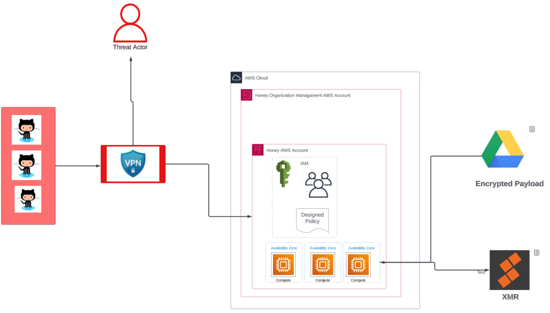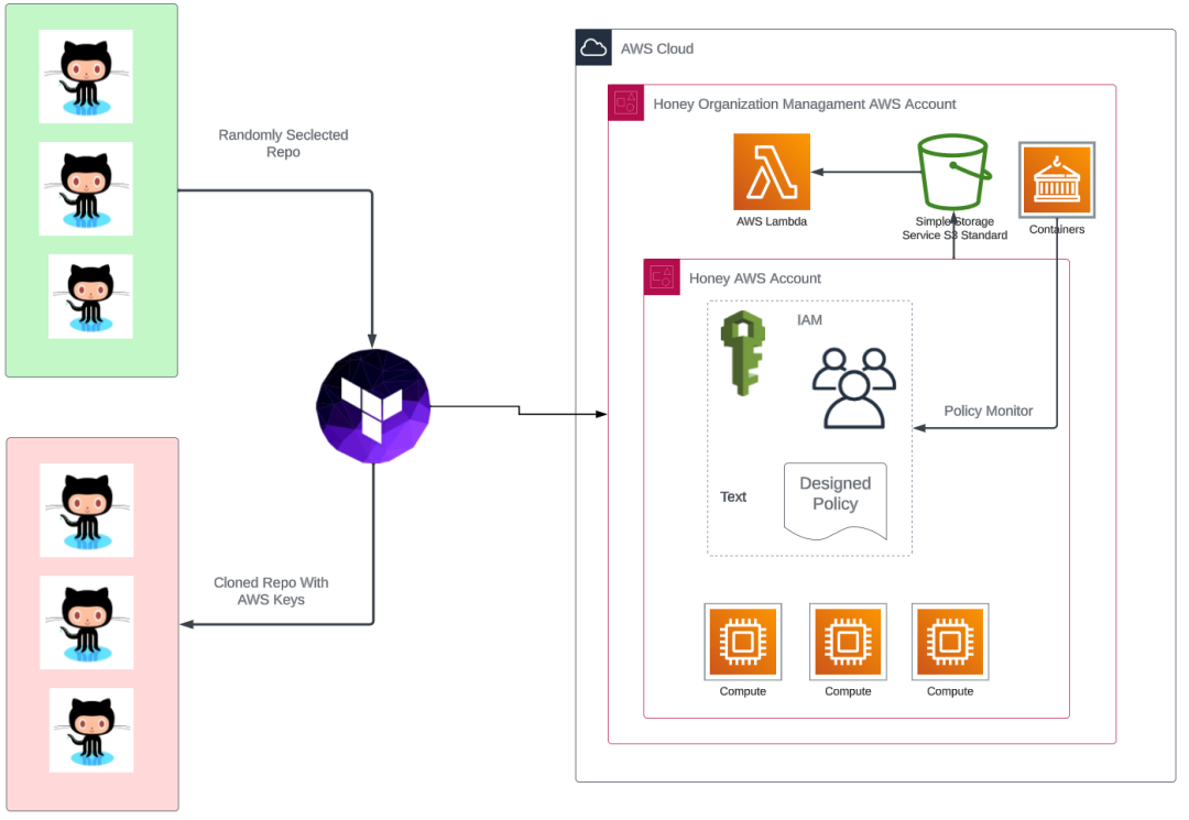 所设计架构的IaC模板负责随机选择GitHub存储库,复制和泄漏AWS IAM密钥作为过去提交的随机文件。在AWS方面,使用相同的AWS管理组织和集中式CloudTrail日志存储,为IaC模板执行的每次迭代动态创建新的AWS帐户。