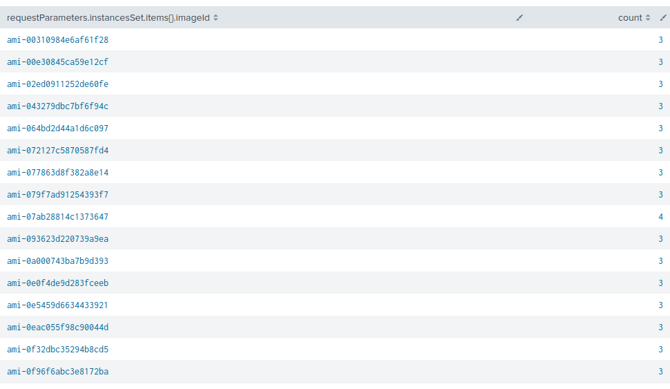 攻击者使用的AMI(Amazon Machine Image类型也很独特,它是用于创建虚拟服务器(即 AWS 环境中的 EC2 实例)的主映像。被识别的映像是私有的,它们没有在AWS市场上列出。下图显示了使用以下AMI实例的id。