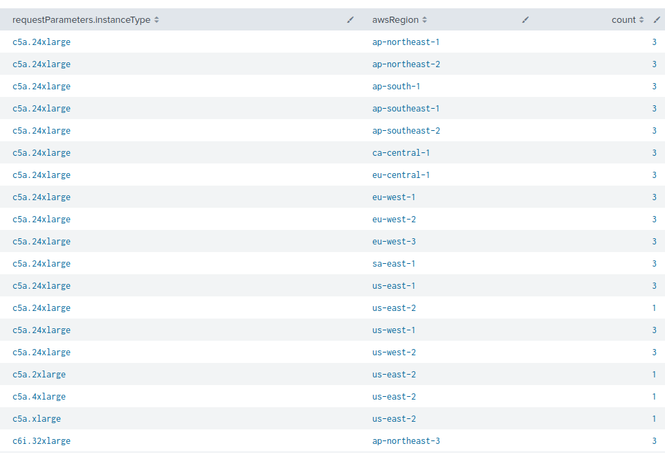 一旦发现AWS密钥,自动化的一部分将包括在不同地区运行实例的攻击者。下图显示了有关实例类型及其跨多个区域分布的统计信息。