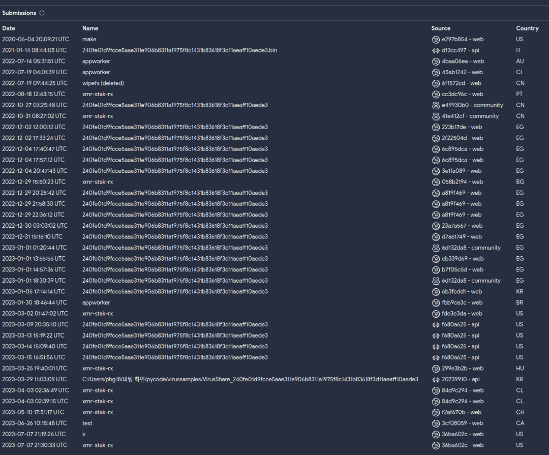 有效负载是一个已知的挖掘工具,哈希值可以与之前的研究相关联,研究人员认为相同的攻击者使用公开泄漏的Docker服务来执行加密劫持。他们还确定了提交给VirusTotal的报告,这些报告具有相同的哈希,并使用相同的持久化命名约定(“appworker”),如下图所示。