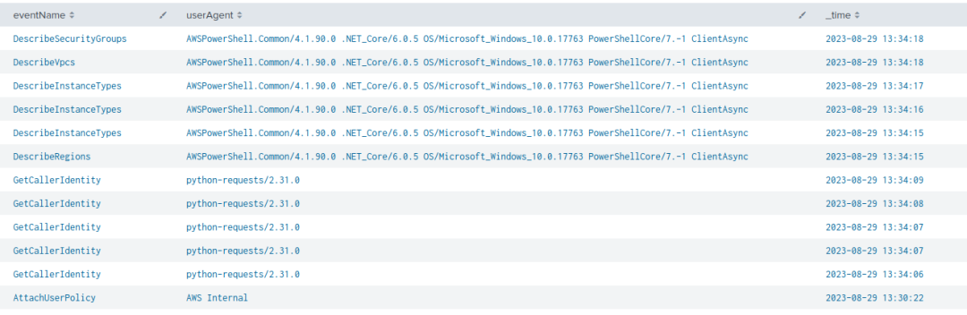上图最后一行显示,从CloudTrail事件AttachUserPolicy开始,AWS在时间13:30:22时应用隔离策略。仅仅四分钟后,在13:34:15,攻击者开始使用AWS API descripregions进行侦察。CloudTrail是一个审计工具,它记录在配置的云资源中发生的和事件。