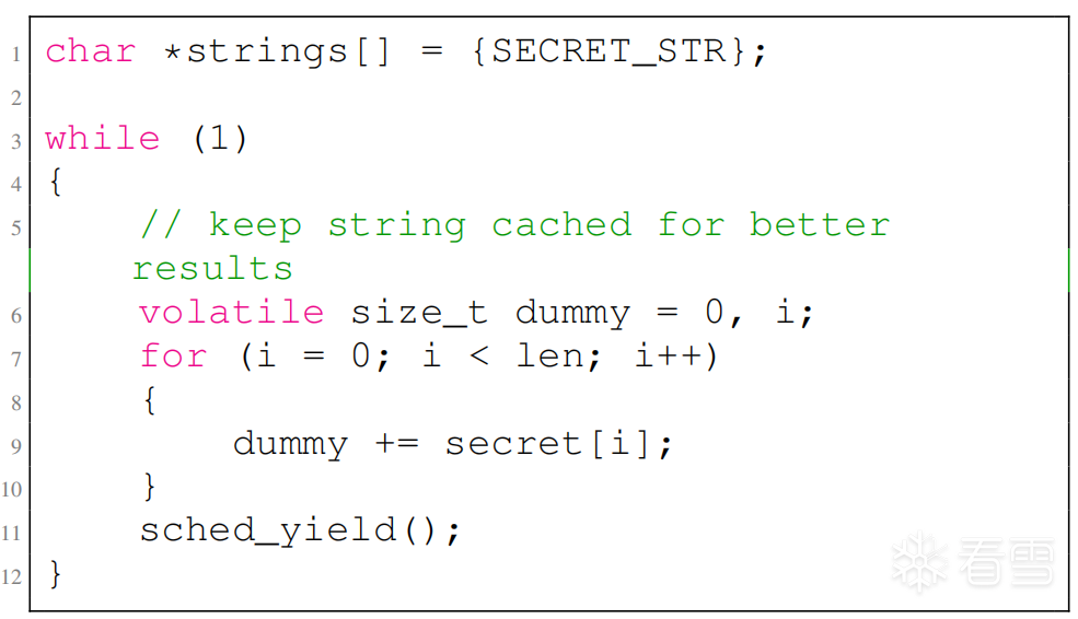 在实验中,发现 EFLAGS 寄存器对 Jcc 指令执行时间的影响并不像缓存状态那样持久。在瞬态执行后大约 6-9 个周期,Jcc 执行时间将不会构建侧信道。根据经验,攻击需要重复数千次才能获得更高的准确性。对于上图的代码,使用事务内存实现 Intel TSX 来完全抑制异常。还使用系统中断处理程序来抑制异常并达到相同的效果。TSX 比瞬态执行攻击的系统中断处理程序更有效。虽然时序argmax的统计分布可以用来解码秘密数据。由于噪声,平均时钟的分布不能用作侧信道,如上图所示。受害者代码如下所示,与 Meltdown中的 POC 相同。实验在与攻击者在同一个物理内核但不同的逻辑内核中并行运行它以获得更高的读取率。受害者将尝试将秘密字符串缓存在缓存行中。为了减轻瞬态执行时序攻击,可以使用延迟 Jcc 指令或在瞬态执行后重写 EFLAGS 寄存器。A. 硬件缓解