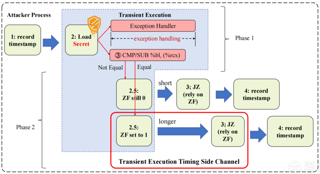 这种计时攻击依赖于其他瞬态执行攻击来构建真实世界的攻击,并且很容易被噪音干扰。但它仍然是一种新的侧信道攻击,值得进一步探索。这种攻击可能会为新的微体系结构攻击带来洞察力,并提供一种在缓存侧信道抗性 CPU 中构建侧信道攻击的新方法。本研究提出了一种新的侧信道攻击,它通过执行时间泄露信息。当ZF在Meltdown攻击的故障导致瞬态执行时由0变为1,虽然瞬态执行后ZF会恢复为0,但JZ等指令的执行时间会稍微长一些。因此,可以通过测量上下文的执行时间来泄漏信息并抛出 EFLAGS 寄存器。与以前的侧信道攻击相比,本研究的攻击不依赖于缓存系统,这可能使其难以被现有工具或方法检测到。参考链接:https://arxiv.org/abs/2304.10877