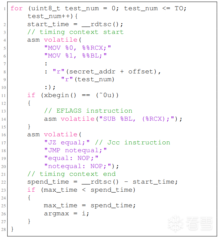 将攻击实施为 Meltdown 攻击的侧信道,如前图所示。攻击由两个阶段组成:在第一阶段,触发瞬态执行并通过 EFLAGS 寄存器对秘密数据进行编码。在第二阶段测量 Jcc 指令上下文的执行时间以解码数据。要通过二进制标志对秘密进行编码,需要使用迭代 test_num 来设置标志。如果 test_num 等于 secret,则标志将被设置并且 secret 将被成功编码。C. 实施细节