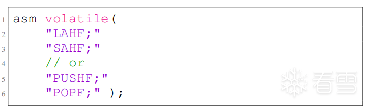 LAHF 和 SAHF 指令是 x86 汇编语言指令,用于操作 x86 处理器中 FLAGS 寄存器的低 8 位。LAHF 指令是“Load AH from Flags”的缩写。它将 FLAGS 寄存器的低 8 位加载到 AH 寄存器,同时保持 AH 寄存器的高 8 位不变。AH 寄存器是一个 16 位寄存器,用于存放 AX 寄存器的高字节。SAHF 指令是“Store AH into Flags”的缩写。它将AH寄存器的低8位存入FLAGS寄存器的低8位,FLAGS寄存器的高8位不变。PUSHF 和 POPF 指令是 x86 汇编语言指令,用于分别将 FLAGS 寄存器的内容压入和弹出堆栈。PUSHF 指令将整个 16 位 FLAGS 寄存器压入栈顶。这包括用于指示算术和逻辑运算结果的状态标志,以及控制处理器行为的其他控制标志。POPF 指令将堆栈顶部的内容弹出到 FLAGS 寄存器中。这可用于在 FLAGS 寄存器被先前的 PUSHF 指令保存后恢复其状态。通过 LAHF 和 SAHF,或 PUSHF 和 POPF 指令重写 EFLAGS,可以减少 EFLAGS 寄存器的影响。此次攻击的根本原因仍未完全了解。研究者猜测 Intel CPU 的执行单元中有一些缓冲区,如果应该撤回执行,则需要一些时间来恢复。如果后续指令依赖于缓冲区的目标,则此撤回过程将导致停顿。D. 限制