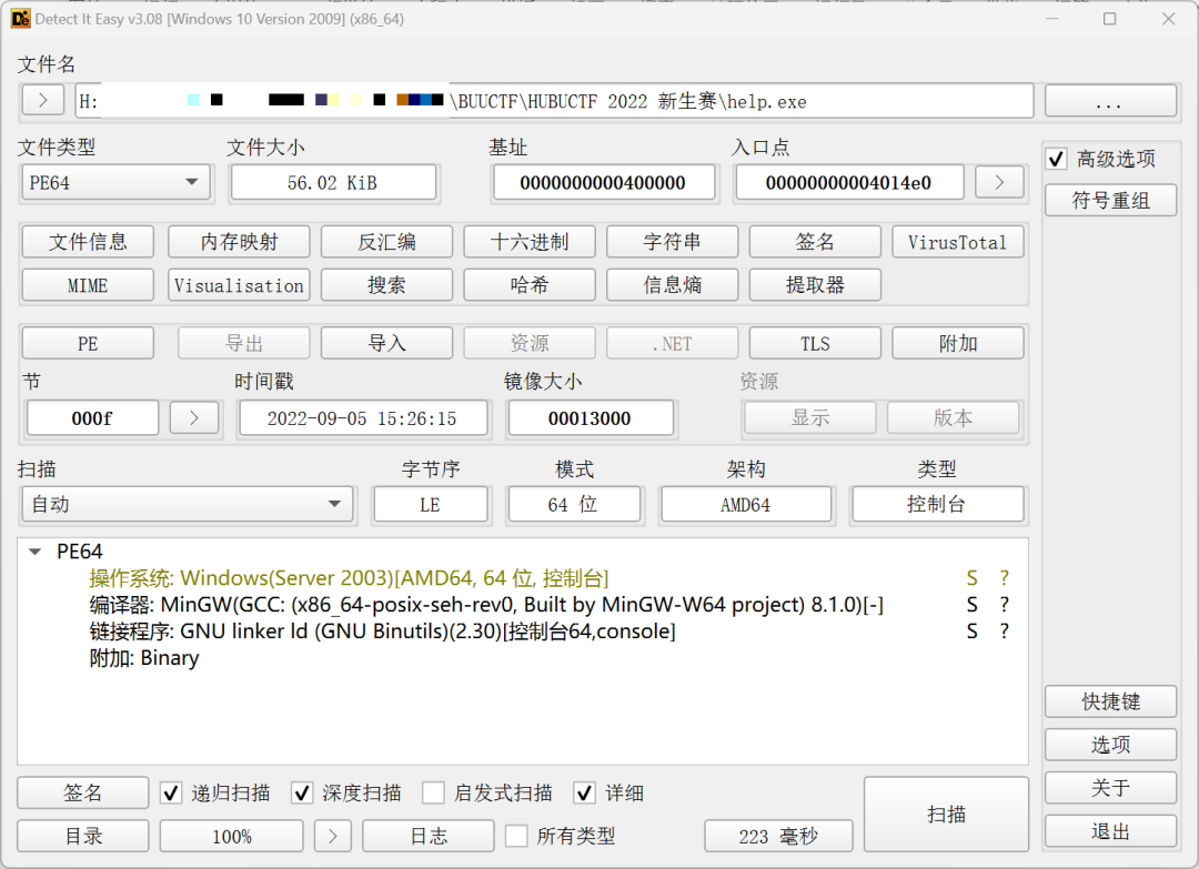信息:文件名: H://BUUCTF/HUBUCTF 2022 新生赛/help.exe大小: 57368(56.02 KiB)操作系统: Windows(Server 2003)架构: AMD64模式: 64 位类型: 控制台字节序: LE