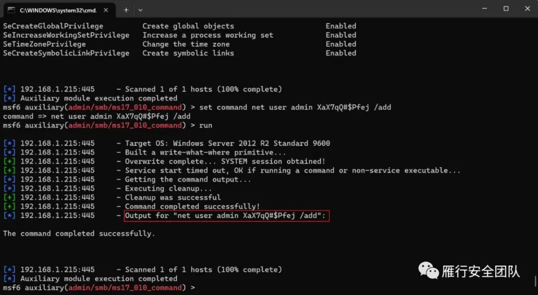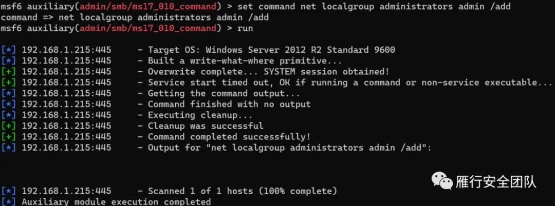 还发现几台ms17017,都试了一遍发现只有192.168.1.215能打,这里用了个不常用的exp,直接执行命令添加了个用户