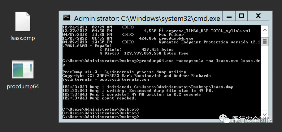 不是很服气,想再导一波lsass。这里是在500用户桌面导出的。