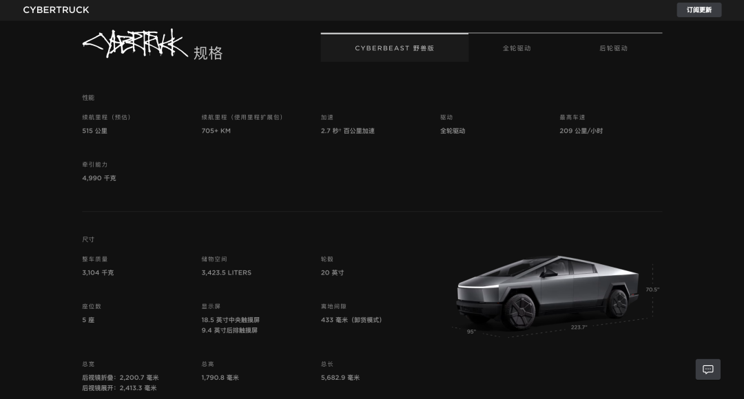 特斯拉北京时间今天凌晨 4 点举办了 Cybertruck 交付活动。发布四年后,特斯拉 Cybertruck 终于迎来了第一批客户。特斯拉官网显示,电动皮卡 Cybertruck 的后轮驱动版本起售价为 60990 美元(约合人民币 43.5 万元),高于 2019 年的原价 39900 美元,该版本要到 2025 年才会推出。特斯拉的订单页面显示,双电机和三电机版本将于 2024 年上市。全驱 Cybertruck 的售价为 79990 美元(约合人民币 57 万元),续航里程为 340 英里,0-60 英里 / 小时加速时间为 4.1 秒,最高时速为 112 英里 / 小时。Cyberbeast 野兽版售价为 99999 美元(约合人民币 71.4 万元),可产生 845 马力和 10296 lb-ft 的扭矩,续航里程约为 320 英里,百公里加速 2.7 秒。在北美交付仪式结束后,特斯拉中文官网也新增了 Cybertruck 相关内容。暴雪已和腾讯、网易洽谈国服回归?腾讯回应:传言不准确