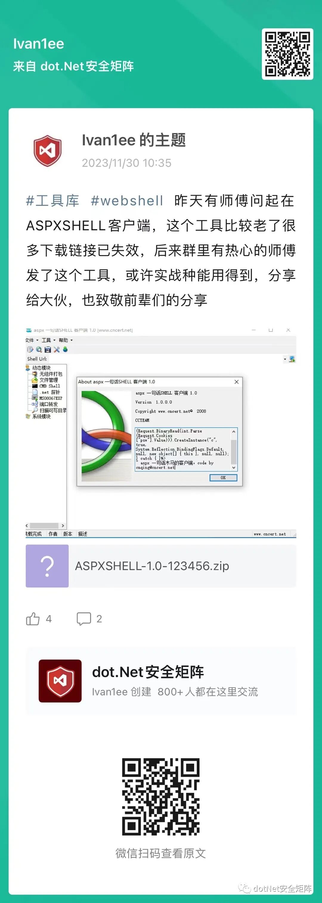 星球汇聚了各行业安全攻防技术大咖,并且每日分享.NET安全技术干货以及交流解答各类技术等问题,社区中发布很多高质量的.NET安全资源,可以说市面上很少见,都是干货。其中主题包括.NET Tricks、漏洞分析、内存马、代码审计、预编译、反序列化、webshell免杀、命令执行、C#工具库等等,后续还会倾力打造专刊、视频等配套学习资源,循序渐进的方式引导加深安全攻防技术提高以及岗位内推等等服务。