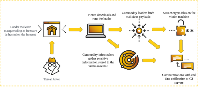 近期,Cybereason的研究人员观察到一些伪装成免费软件或者破解软件的恶意程序加载器分发DJvu勒索软件变体。攻击链从伪装的安装程序压缩包开始,程序多为免费软件或者破解软件。当用户解压压缩包后,压缩文件中包含一个install.exe文件,该文件是一个巨大的二进制文件,查看其元数据可以看出该程序试图伪装成PDF编辑器。进一步分析发现该安装文件携带PrivateLoader代码,PrivateLoader是一个付费下载器,首次出现于2021年,常常出现在提供免费软件与破解软件的网站上。经安全人员观察,该下载器曾与位于俄罗斯、马来西亚、丹麦的C2服务器进行通信,可部署多种恶意软件,包括Redline Stealer、Vidar、Amadey、Nymai、XmRig、LummaC Stealer。此次部署DJvu勒索软件变体的活动中,一旦用户执行下载器,DJvu勒索软件变体将被运行。变体首先会创建注册表建立持久性,外联C2服务器,在指定路径部署Vidar infostealer及Clipbanker恶意程序。第二阶段,程序将使用AES算法加密用户目录下的文件,并且采用Process Hollowing技术避免安全检查。加密文件以Xaro结尾,加密完成后,程序将留下勒索信,勒索信要求受害者通过邮件进行联系,并且表示如果受害者在72小时内联系可获得半价赎金优惠。攻击链图如下图所示。