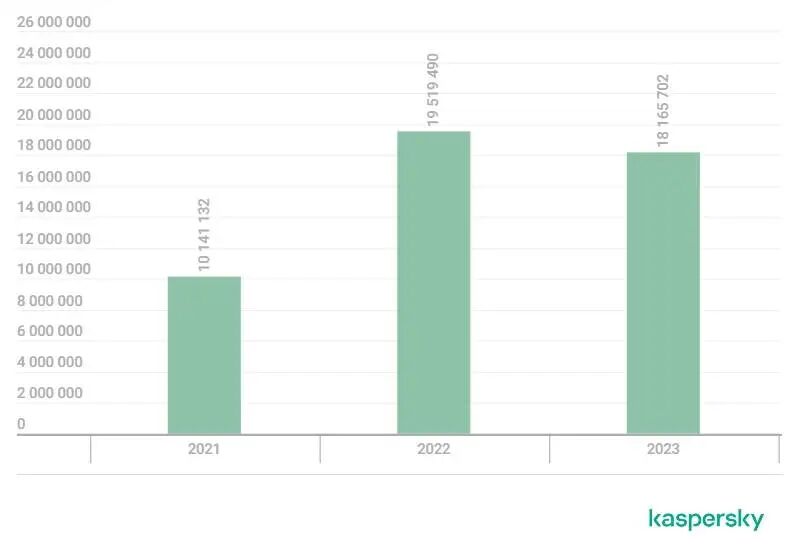 2023年,尽管银行木马攻击减少了7%,但网络犯罪分子仍在持续使用这些技术。去年,卡巴斯基产品检测并阻止了近2000万次攻击,同比增长了92%,但这一数字基本保持不变。这凸显了网络犯罪分子在试图破坏网络安全时所面临的持续挑战和不断发展的策略。