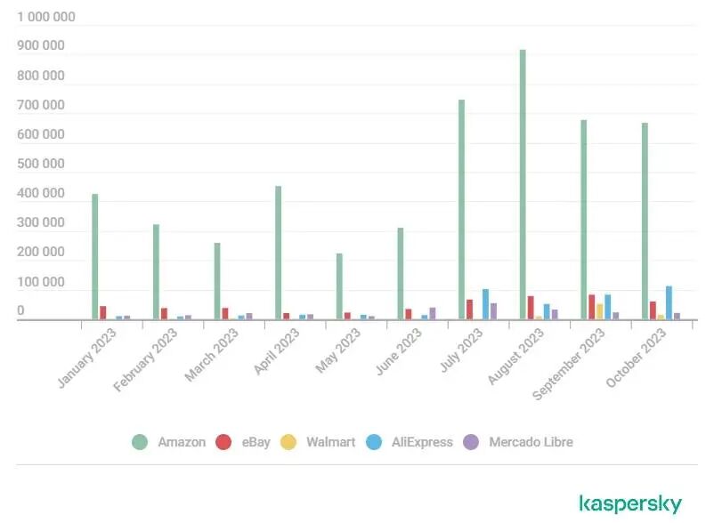 仿冒流行购物平台(亚马逊、eBay、沃尔玛、全球速卖通和Mercado Libre)的钓鱼网页在2023年前10个月总计达到600多万个。