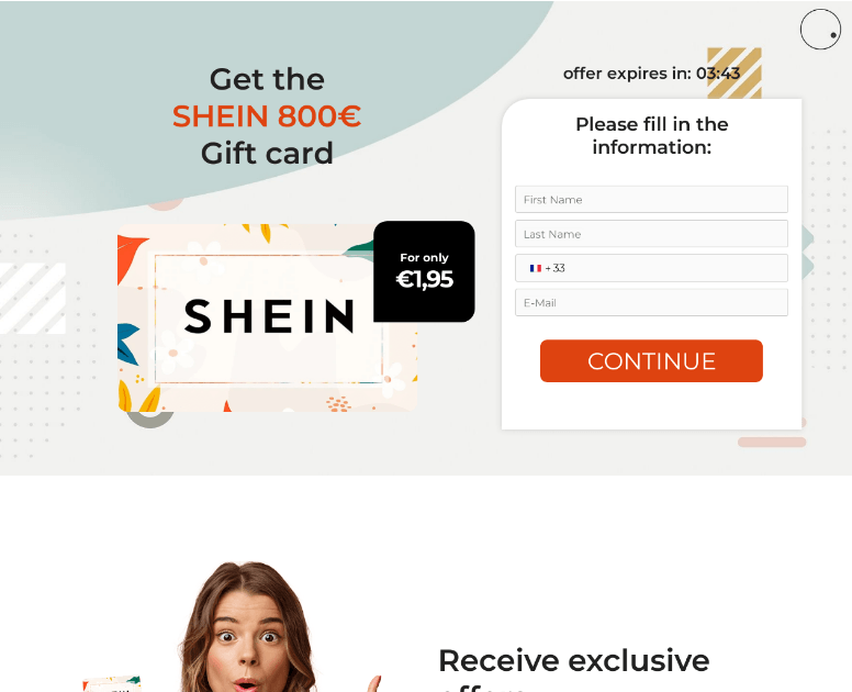 另一种方案是,受害者将一张卡(据说是用来支付商品的)捆绑在诈骗者的账号上,直至将受害者的账户掏空。例如,下图所示的假冒网站模仿了一个知名的购物平台,以1.95欧元的价格购买800欧元的礼品卡来吸引用户。为了获得这个看似不可抗拒的交易,用户被提示提供他们的联系信息并继续付款。然而,这个务必会落入诈骗圈套。