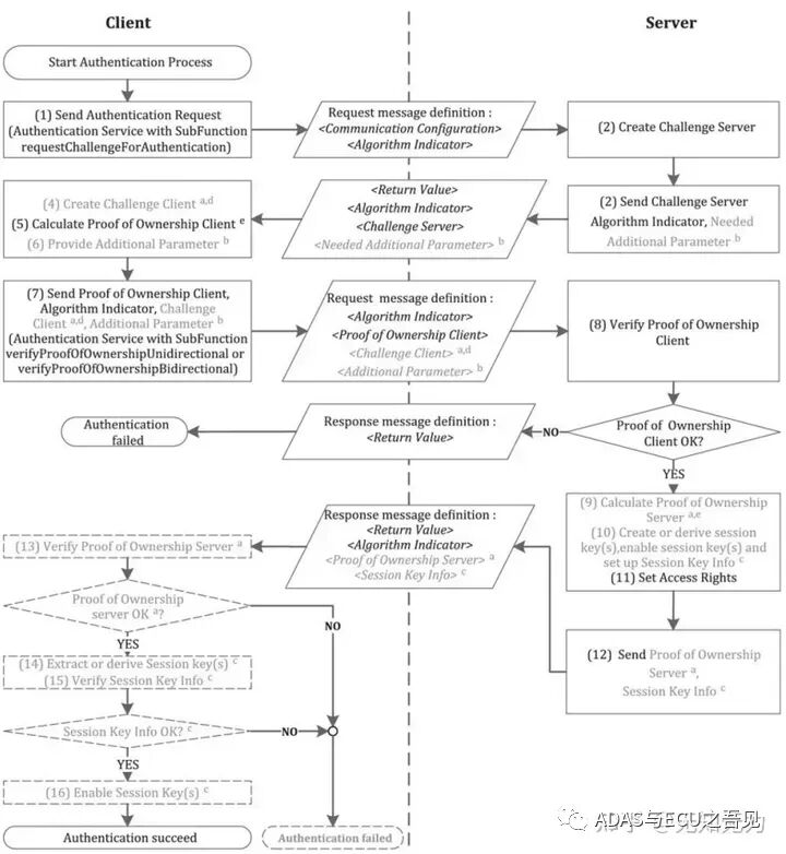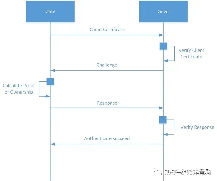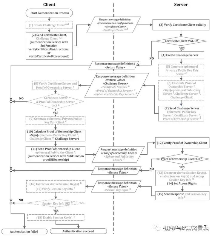 上图既包含单向认证(对client的认证)也包含双向认证的过程,除此以外还包含认证成功后的安全诊断通信(secure diagnostic communication)所需的密钥传递过程。