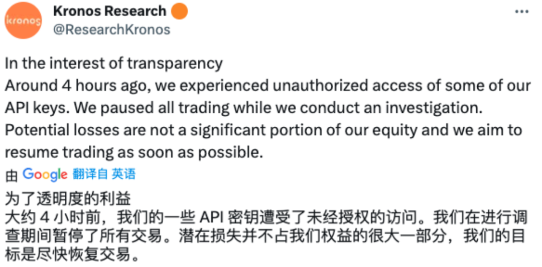 2023 年 11 月 19 日,加密量化公司 Kronos Research 在推特发文称其一些 API 密钥遭到未经授权的访问,此次攻击造成 13,007 枚 ETH 的损失,约为 2,600 万美元。
