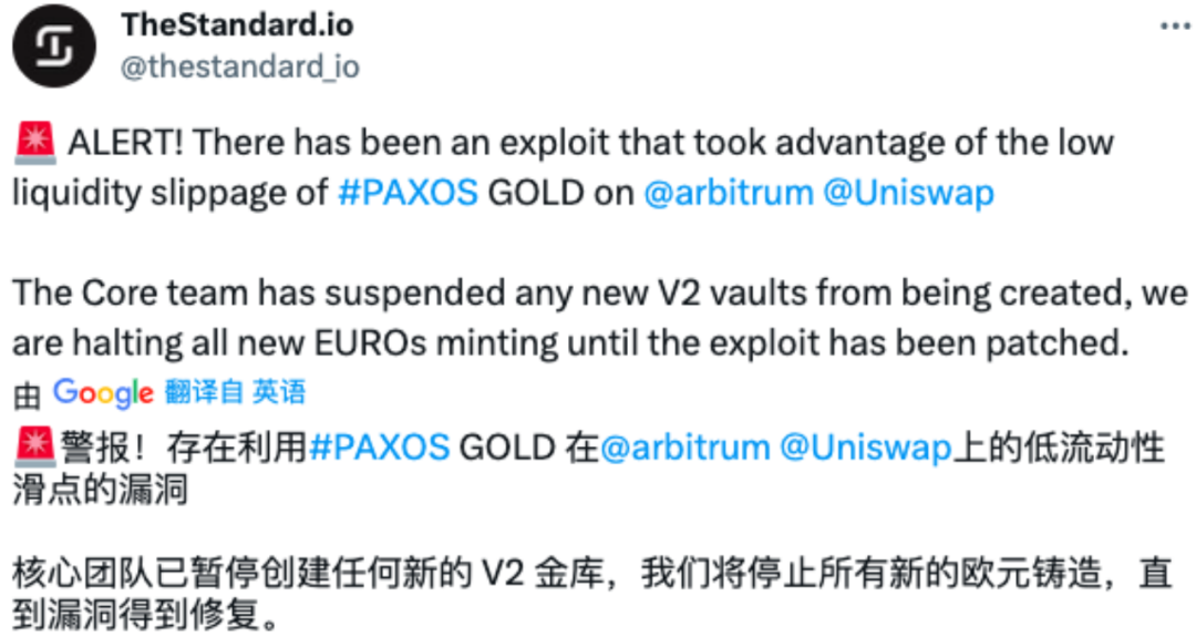 2023 年 11 月 7 日,去中心化超额抵押稳定币协议 TheStandard.io 遭攻击,损失约 29 万美元。该漏洞的关键在于 PAXG 池的低流动性,攻击者利用该漏洞操纵市场。11 月 9 日,攻击者向协议返还了 24.3 万枚 EUROs。