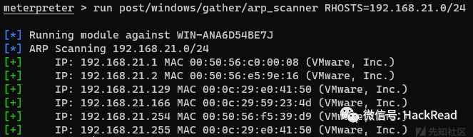 meterpreter > run post/windows/gather/arp_scanner RHOSTS=192.168.21.0/24
