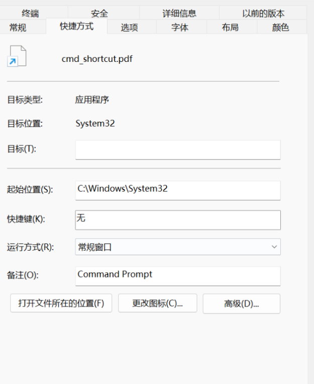 因为快捷方式只能容纳 260 个字符,我在参数添加了 n 个空格作为隐藏,其真实参数为/k calc 为启动一个计算机的操作,运行生成 cmd_shortcut.lnk