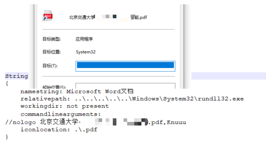 然后打开属性查看快捷方式,看到他运行了一个 rundll32.exe 的文件,应该很多人已经知道这是为了调恶意的 dll,但一看就一个 rundll32.exe 后面全被空格隐藏了后面的命令执行