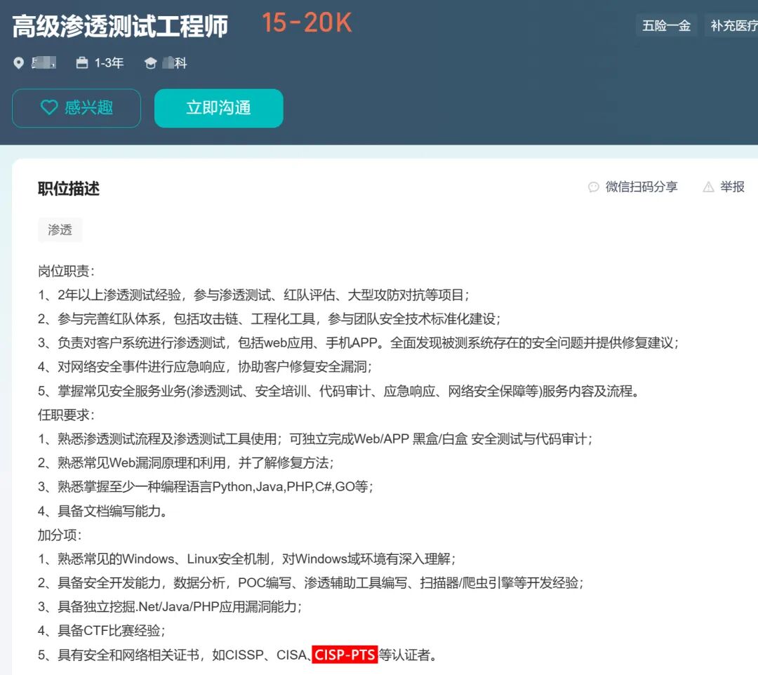 渗透测试人才在市场上颇受欢迎,薪资水平也较高,而且入职门槛学历要求相对不高。由中国信息安全测评中心背书的CISP-PTS注册信息安全专业人员渗透测试专家认证就是目前国内认可度很高的一门渗透测试相关认证。该认证要求证书持有者对当前主流渗透测试技术深入掌握,并能熟练应用技术实施渗透测试,受到国内各大安全厂商以及甲方的高度认可。