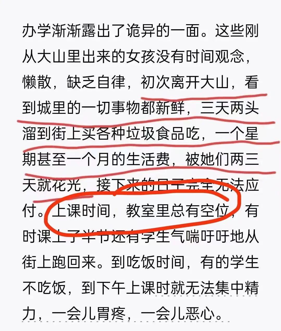 没错,我们同所有善良的人一样,期待这些享受国家帮助免费上女高的女学生是我们想象中积极向上奋发进取努力摆脱贫困主动刻苦学习的孩子,然后办学初期的现实却是冰冷的,给我们每一个人内心浇了一盆冷水。
