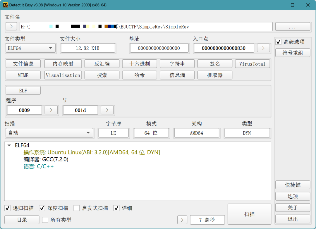 信息:文件名: H://BUUCTF/SimpleRev/SimpleRev大小: 13128(12.82 KiB)操作系统: Ubuntu Linux(ABI: 3.2.0)架构: AMD64模式: 64 位类型: DYN字节序: LE