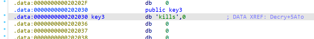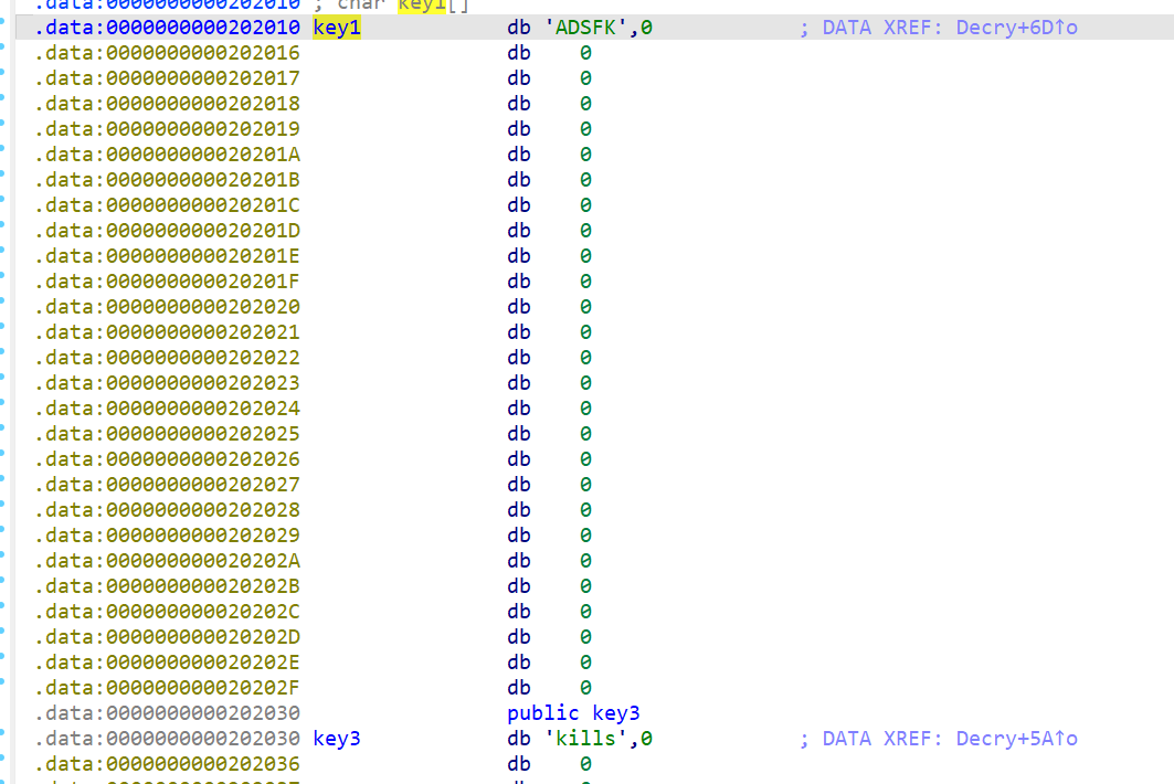 涉及大小端存储问题,elf文件这种通常使用小端存储,而IDA会把内存中的数据自动转成大端存储,但是有些变量双击过去,在文本视图能直接看到转好的字符串,以key3为例