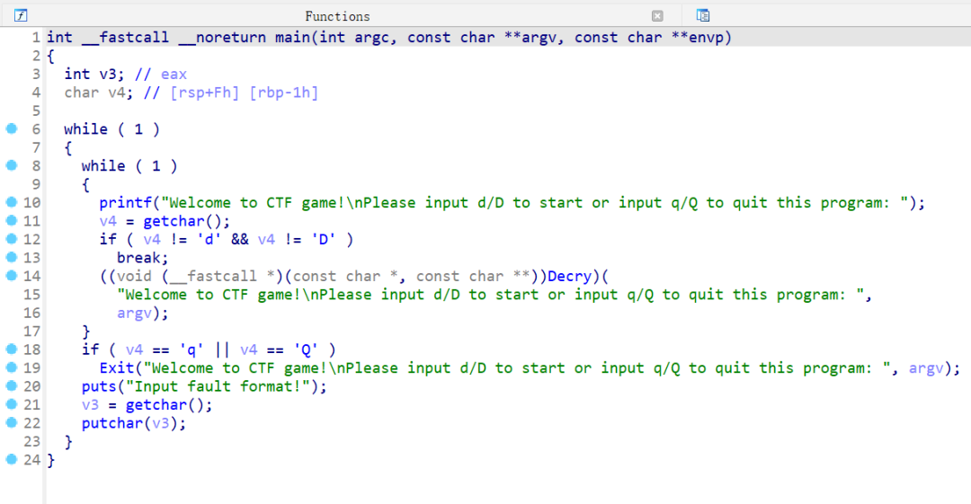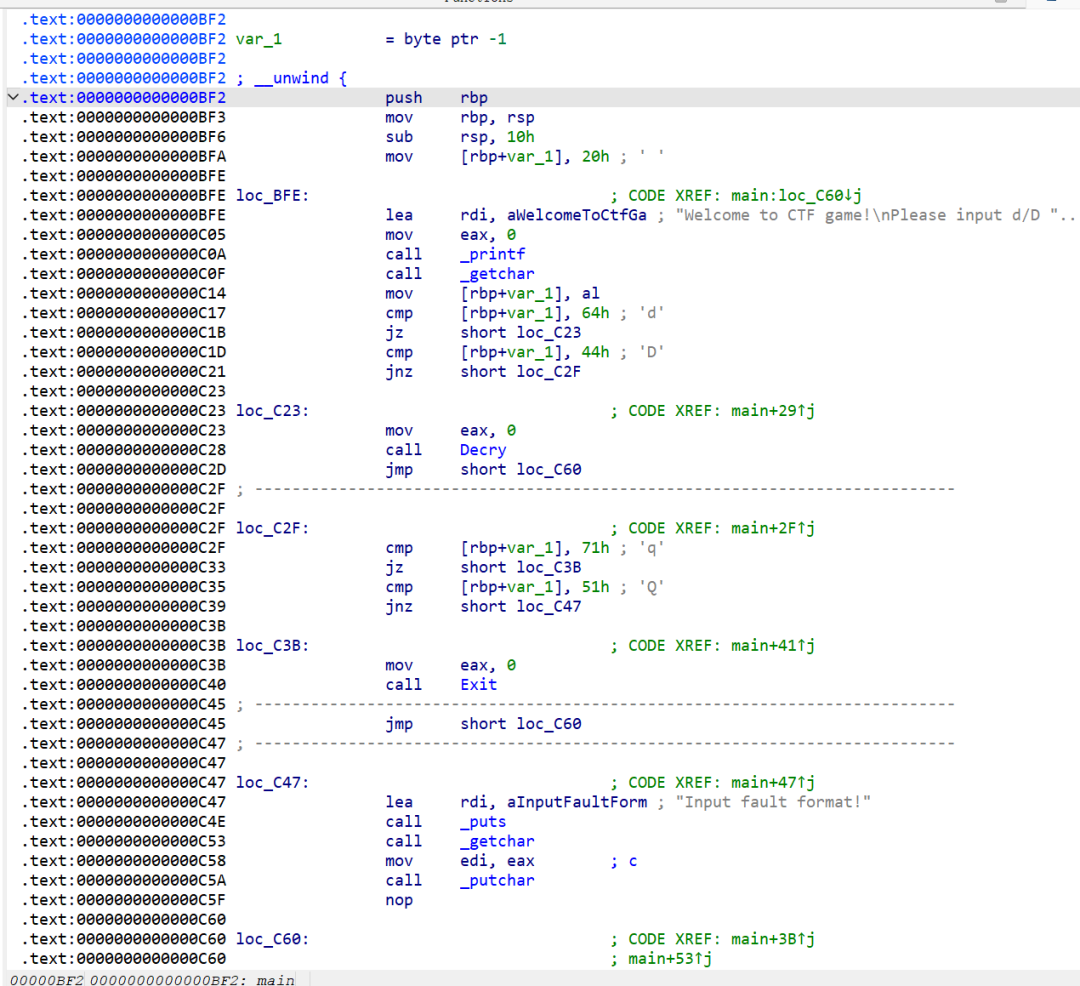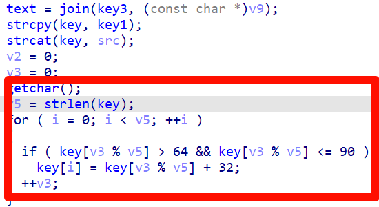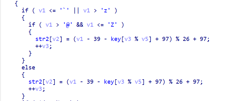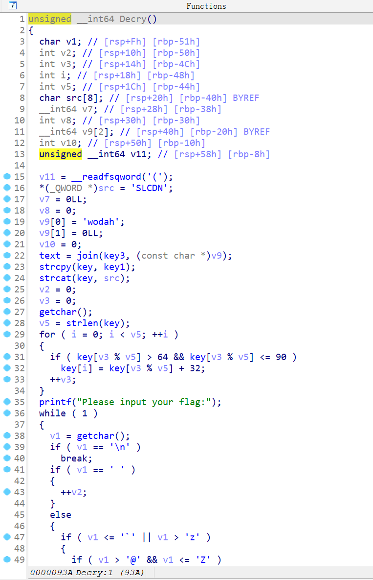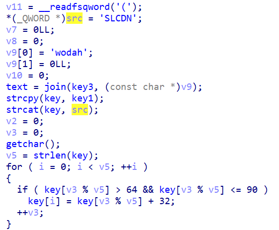 unsigned __int64 Decry(){char v1; // [rsp+Fh] [rbp-51h]int v2; // [rsp+10h] [rbp-50h]int v3; // [rsp+14h] [rbp-4Ch]int i; // [rsp+18h] [rbp-48h]int v5; // [rsp+1Ch] [rbp-44h]char src[8]; // [rsp+20h] [rbp-40h] BYREF__int64 v7; // [rsp+28h] [rbp-38h]int v8; // [rsp+30h] [rbp-30h]__int64 v9[2]; // [rsp+40h] [rbp-20h] BYREFint v10; // [rsp+50h] [rbp-10h]unsigned __int64 v11; // [rsp+58h] [rbp-8h]v11 = __readfsqword('(');*(_QWORD *)src = 'SLCDN';v7 = 0LL;v8 = 0;v9[0] = 'wodah';v9[1] = 0LL;v10 = 0;text = join(key3, (const char *)v9);strcpy(key, key1);strcat(key, src);v2 = 0;v3 = 0;getchar();v5 = strlen(key);for ( i = 0; i < v5; ++i ){if ( key[v3 % v5] > 64 && key[v3 % v5] <= 90 )key[i] = key[v3 % v5] + 32;++v3;}printf("Please input your flag:");while ( 1 ){v1 = getchar();if ( v1 == '\n' )break;if ( v1 == ' ' ){++v2;}else{if ( v1 <= '`' || v1 > 'z' ){if ( v1 > '@' && v1 <= 'Z' ){str2[v2] = (v1 - 39 - key[v3 % v5] + 97) % 26 + 97;++v3;}}else{str2[v2] = (v1 - 39 - key[v3 % v5] + 97) % 26 + 97;++v3;}if ( !(v3 % v5) )putchar(32);++v2;}}if ( !strcmp(text, str2) )puts("Congratulation!\n");elseputs("Try again!\n");return __readfsqword(0x28u) ^ v11;}